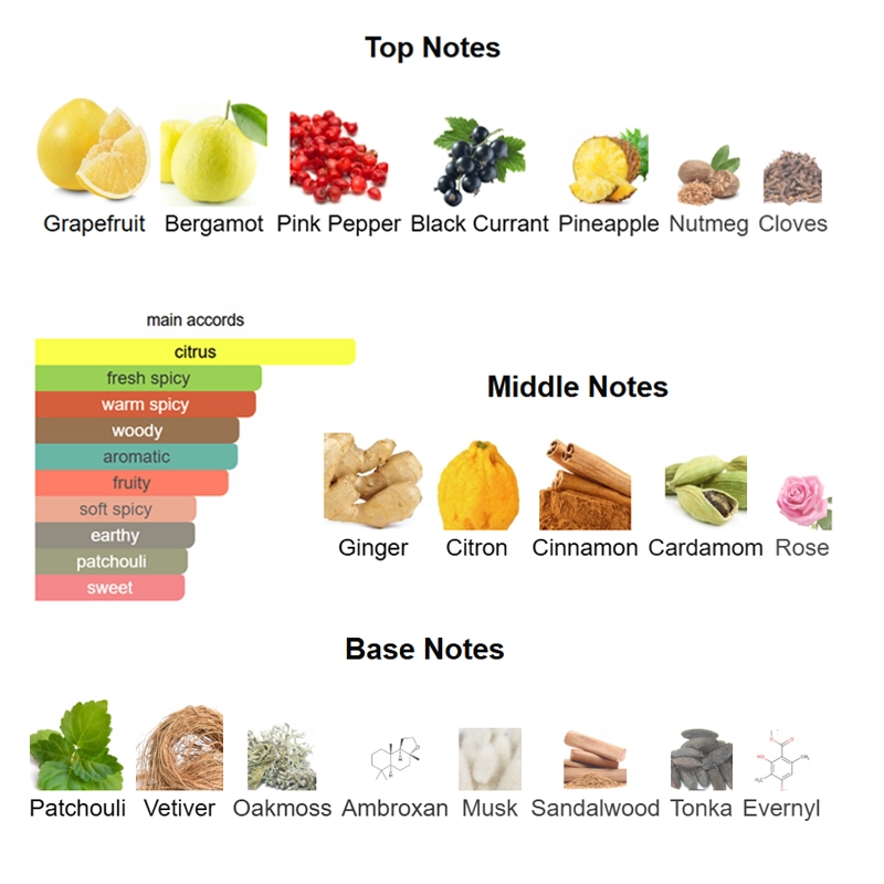 Top notes are Grapefruit, Bergamot, Pink Pepper, Black Currant, Pineapple, Nutmeg and Cloves; middle notes are Ginger, Cinnamon, Citron, Cardamom and Rose; base notes are Patchouli, Vetiver, Oakmoss, Ambroxan, Sandalwood, Musk, Tonka and Evernyl.