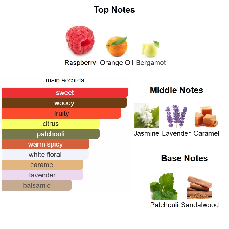 Top notes are Raspberry, Orange Oil and Bergamot; middle notes are Jasmine, Lavender and Caramel; base notes are Patchouli and Sandalwood.