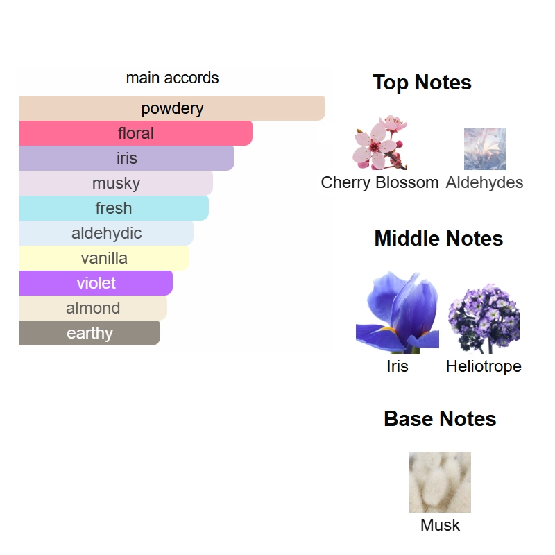 op notes are Cherry Blossom and Aldehydes; middle notes are Iris and Heliotrope; base note is Musk.