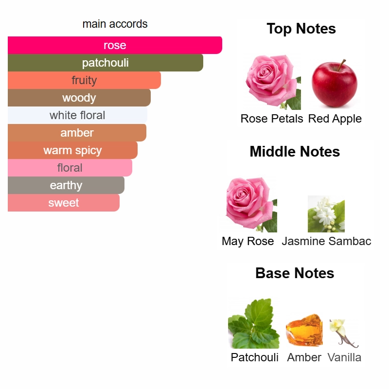 Top notes are Rose Petals and Red Apple; middle notes are May Rose and Jasmine Sambac; base notes are Patchouli, Amber and Vanilla.