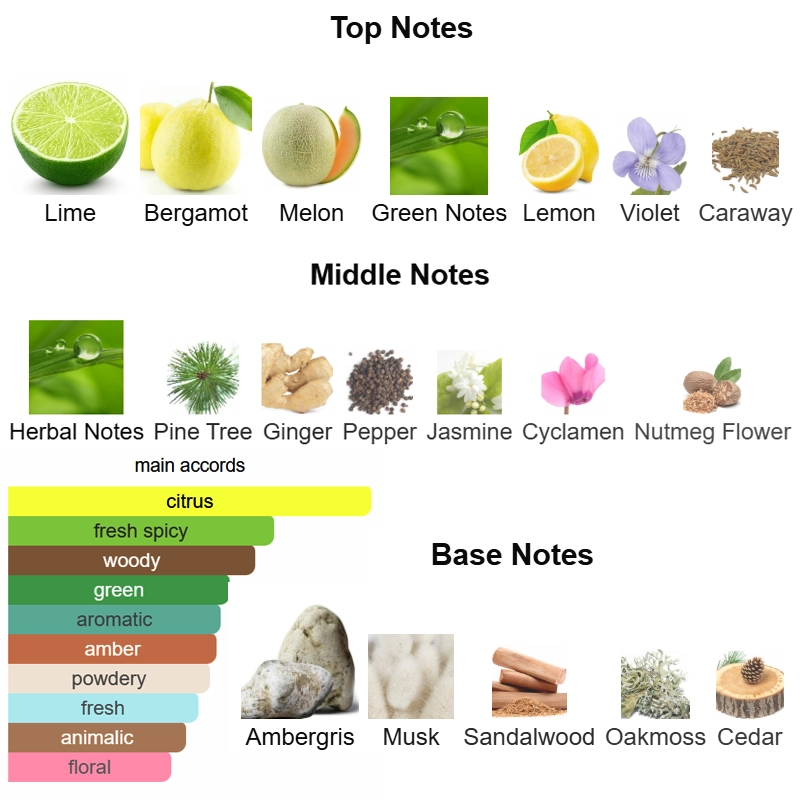 Top notes are Lime, Bergamot, Melon, Green Notes, Lemon, Violet and Caraway; middle notes are Herbal Notes, Pine Tree, Ginger, Pepper, Jasmine, Cyclamen and Nutmeg Flower; base notes are Ambergris, Musk, Sandalwood, Oakmoss and Cedar.