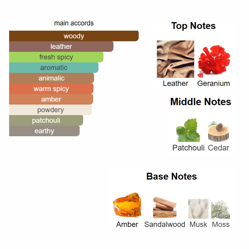 Top notes are Leather and Geranium; middle notes are Patchouli and Cedar; base notes are Amber, Sandalwood, Musk and Moss.
