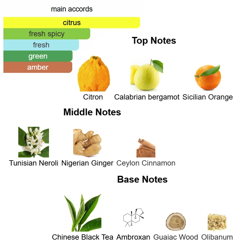 Top notes are Citron, Calabrian bergamot and Sicilian Orange; middle notes are Tunisian Neroli, Nigerian Ginger and Ceylon Cinnamon; base notes are Chinese Black Tea, Ambroxan, Guaiac Wood and Olibanum.