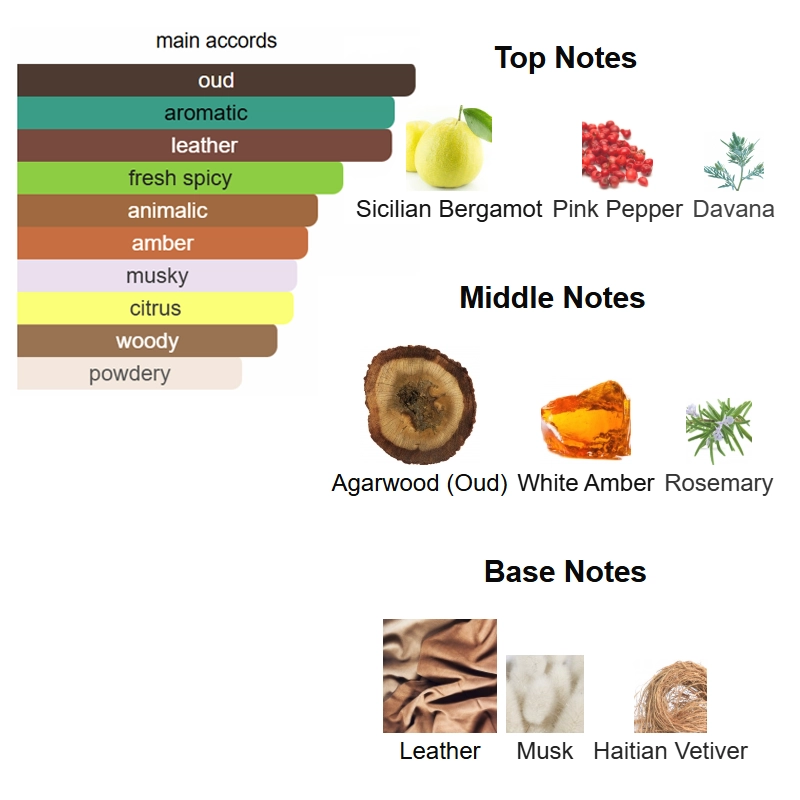 Top notes are Sicilian Bergamot, Pink Pepper and Davana; middle notes are Agarwood (Oud), White Amber and Rosemary; base notes are Leather, Musk and Haitian Vetiver.