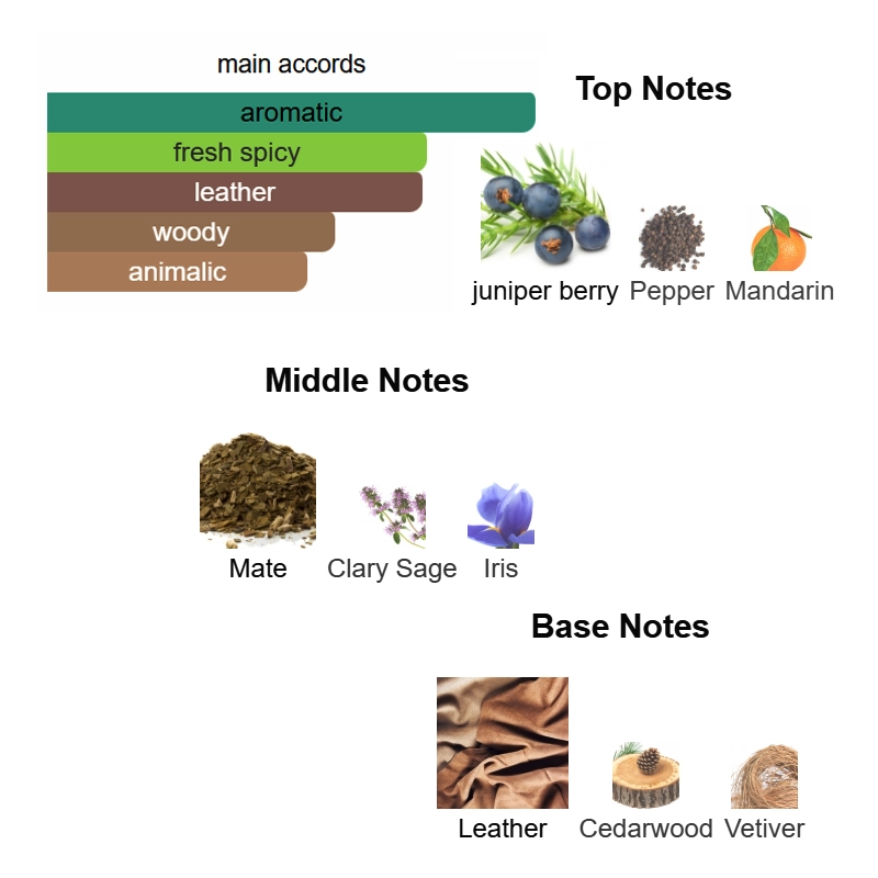 Top notes are juniper berry, Pepper and Mandarin; middle notes are Mate, Clary Sage and Iris; base notes are Leather, Cedarwood and Vetiver.