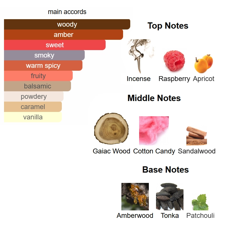 Top notes are Incense, Raspberry and Apricot; middle notes are Gaiac Wood, Cotton Candy and Sandalwood; base notes are Amberwood, Tonka and Patchouli.