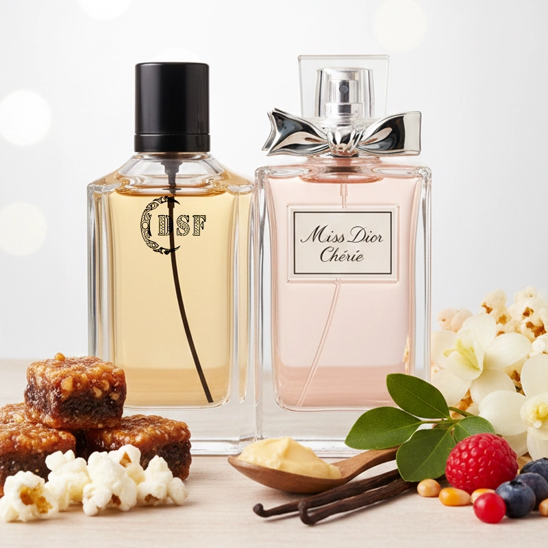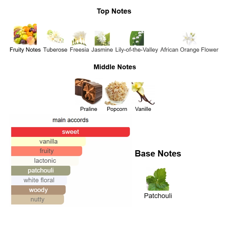 Top notes are Fruity Notes, Tuberose, Freesia, Jasmine, Lily-of-the-Valley and African Orange Flower; middle notes are Praline, Popcorn and Vanille; base note is Patchouli.