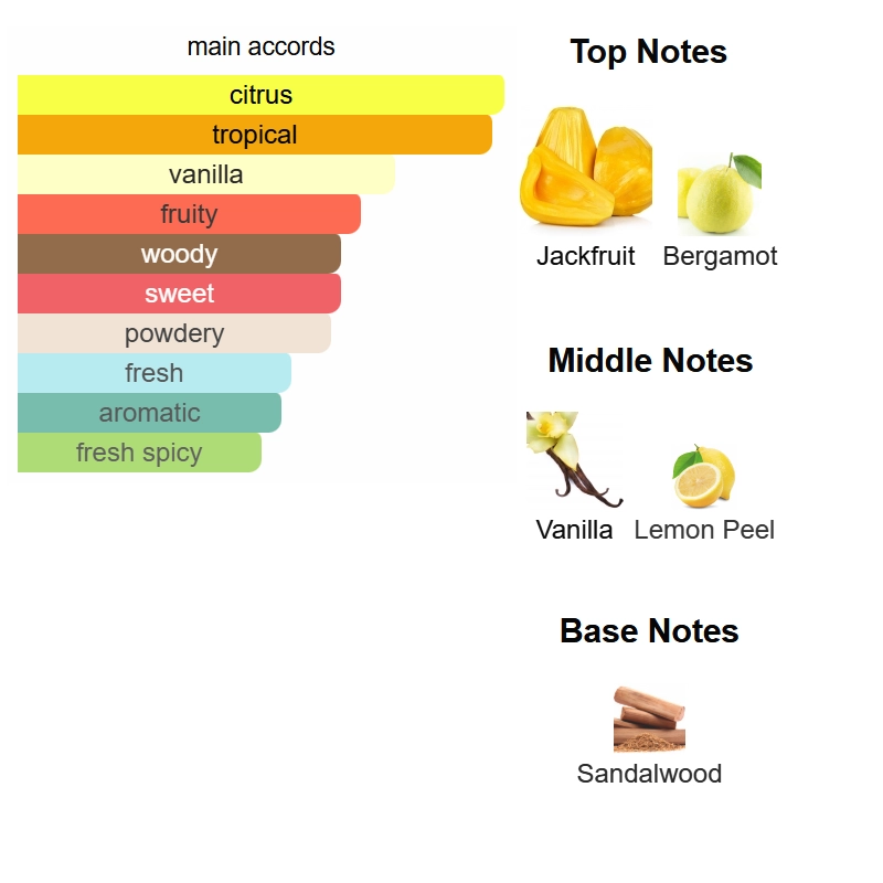 Top notes are Jackfruit and Bergamot; middle notes are Vanilla and Lemon Peel; base note is Sandalwood.