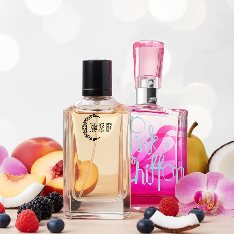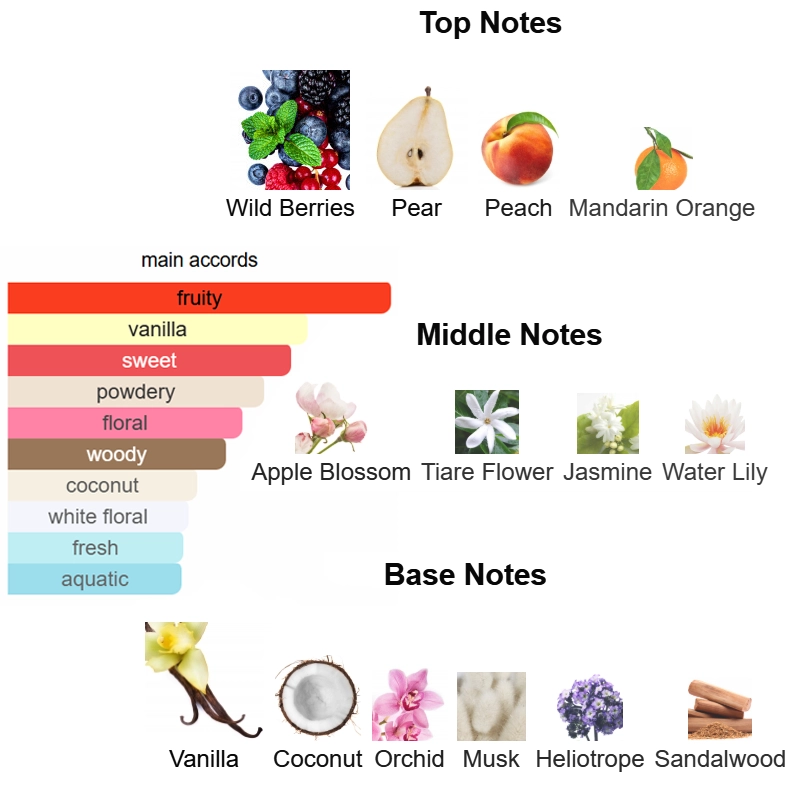 Top notes are Wild Berries, Pear, Peach and Mandarin Orange; middle notes are Apple Blossom, Tiare Flower, Jasmine and Water Lily; base notes are Vanilla, Coconut, Orchid, Musk, Heliotrope and Sandalwood.