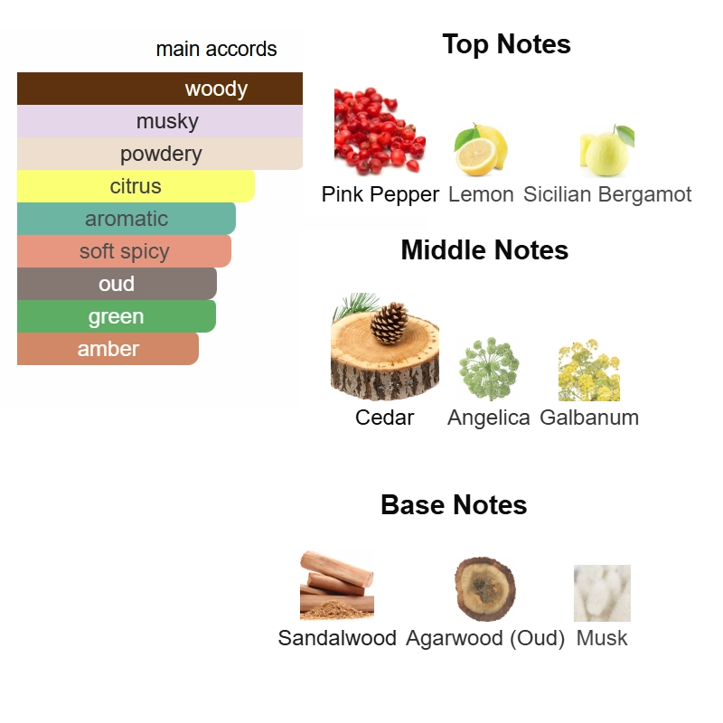 Base notes are Sandalwood, Agarwood (Oud) and Musk.