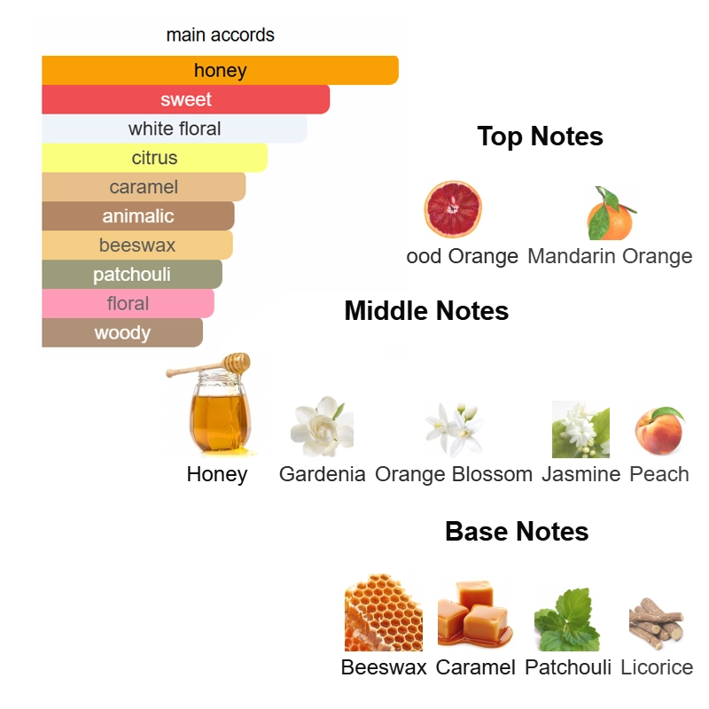 Middle notes are Honey, Gardenia, Orange Blossom, Jasmine and Peach;