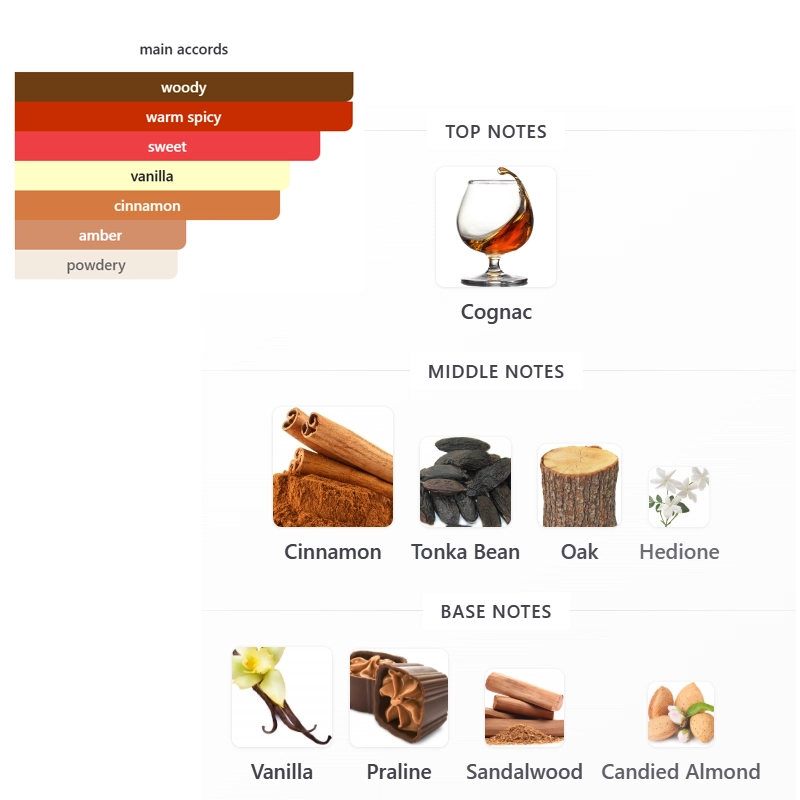 Middle notes are Cinnamon, Tonka Bean, Oak and Hedione