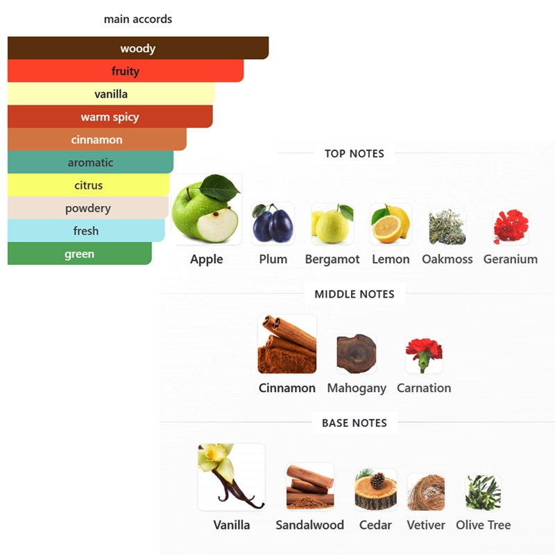 Top notes are Apple, Plum, Bergamot, Lemon, Oakmoss and Geranium; middle notes are Cinnamon, Mahogany and Carnation; base notes are Vanilla, Sandalwood, Cedar, Vetiver and Olive Tree.