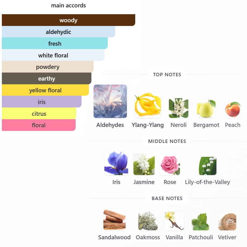 Top notes are Aldehydes, Ylang-Ylang, Neroli, Bergamot and Peach;