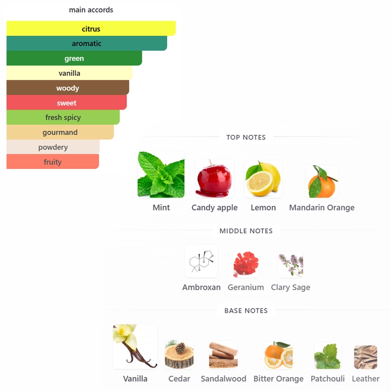 Top notes are Mint, Candy apple, Lemon and Mandarin Orange;