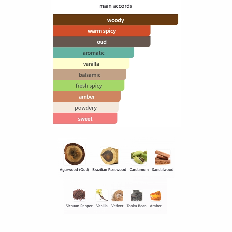 The fragrance features Agarwood (Oud), Brazilian Rosewood, Cardamom, Sandalwood, Sichuan Pepper, Vanilla, Vetiver, Tonka Bean and Amber.