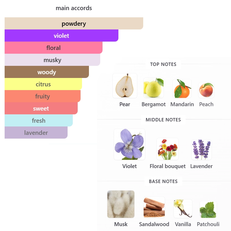 Top notes are Pear, Bergamot, Mandarin and Peach