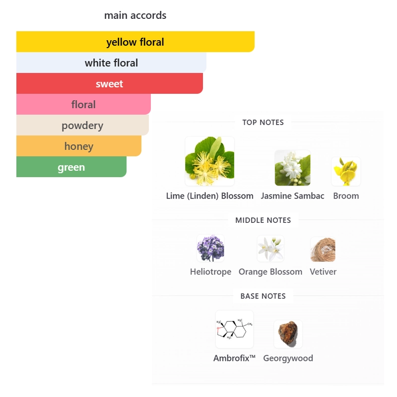 Top notes are Lime (Linden) Blossom, Jasmine Sambac and Broom